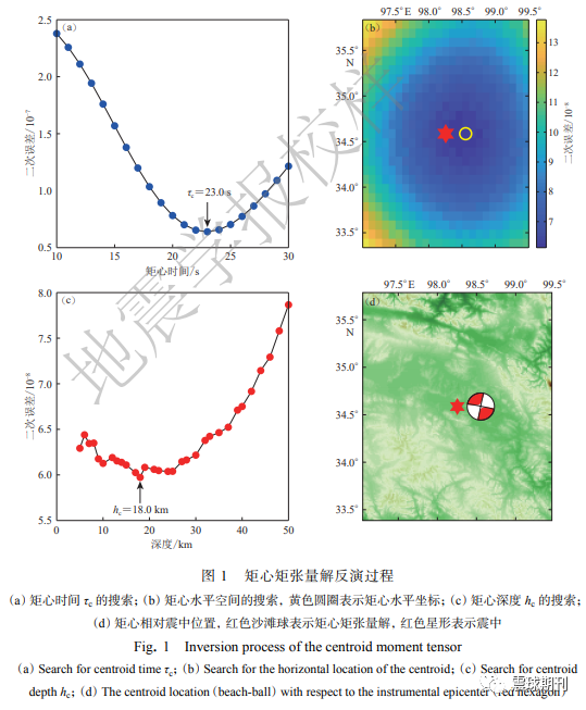 對比可見:本研究結果與USGS給出的震源機制解、矩心位置差異較大(圖3),USGS給出的矩心位置與預設震中(PDE)重合,而本研究結果則位于震中東側,該結果與GCMT發(fā)布的震源機制解非常接近,但矩心位置位于GCMT標定的矩心位置東南約11 km處(圖3)。另外,矩心深度明顯不同,本研究的結果(18 km)介于USGS的結果(23.5 km)與GCMT的結果(12