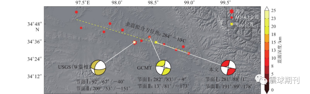 km)之間,經過修改模型并多次重復實驗仍未消除這種差異,造成這種深度不確定性的原因是多方面的,除因多數矩心矩張量反演所用的頻帶較低導致垂直分辨率較弱以外,青藏高原本身地下結構與反演所用的AK135模型存在偏差也會影響矩心深度的定位。本研究反演得到的標量地震矩略高于GCMT和USGS的結果,矩心時間(23 s)也明顯滯后。根據余震展布的總體趨勢估計斷層面走向約為284°,這與本研究反演得到的281°的節(jié)面非常吻合,表明這是發(fā)生在走向為281°且近乎直立的斷層面上的一次走滑事件。