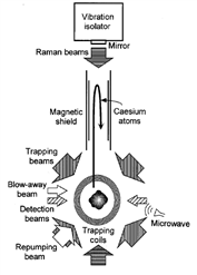 華裔科學(xué)家朱棣文教授原子噴泉技術(shù)研究的突破,為原子干涉絕對(duì)重力測(cè)量提供了必須的原子操控技術(shù)。與激光干涉原理中做自由下落運(yùn)動(dòng)的宏觀物體相比,這里做自由下落運(yùn)動(dòng)的是微觀的原子團(tuán)。原子團(tuán)自由下落過程中,由于重力場(chǎng)的作用,其布局?jǐn)?shù)會(huì)發(fā)生改變,因此可以通過擬合多個(gè)原子團(tuán)自由下落前后布局?jǐn)?shù)的變化形成的周期性變化信號(hào),通過相位與重力加速度絕對(duì)值的線性關(guān)系實(shí)現(xiàn)測(cè)量目標(biāo)。目前原子干涉絕對(duì)重力測(cè)量的準(zhǔn)確度可以實(shí)現(xiàn)10μGal量級(jí)。