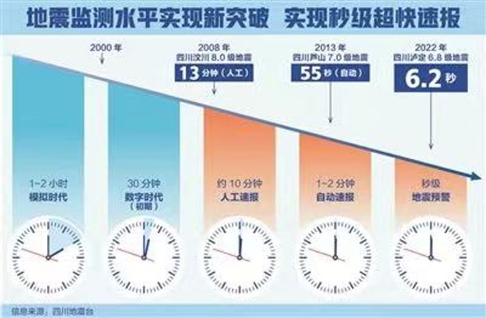 不僅如此,監(jiān)測能力、產(chǎn)出速度也有了很大提升。2008年,四川地震臺只能對3.5級以上地震作出處置,如今全省平均1.6級就可以處置,瀘定6.8級地震的余震甚至能監(jiān)測到1級以下地震。2008年汶川8.0級地震時,最快處理出地震參數(shù)需要13分鐘,2013年蘆山7.0級地震55秒產(chǎn)出自動速報結(jié)果,2021年瀘縣6.0級地震,震后4.8秒就已對外發(fā)布地震預(yù)警信息。
