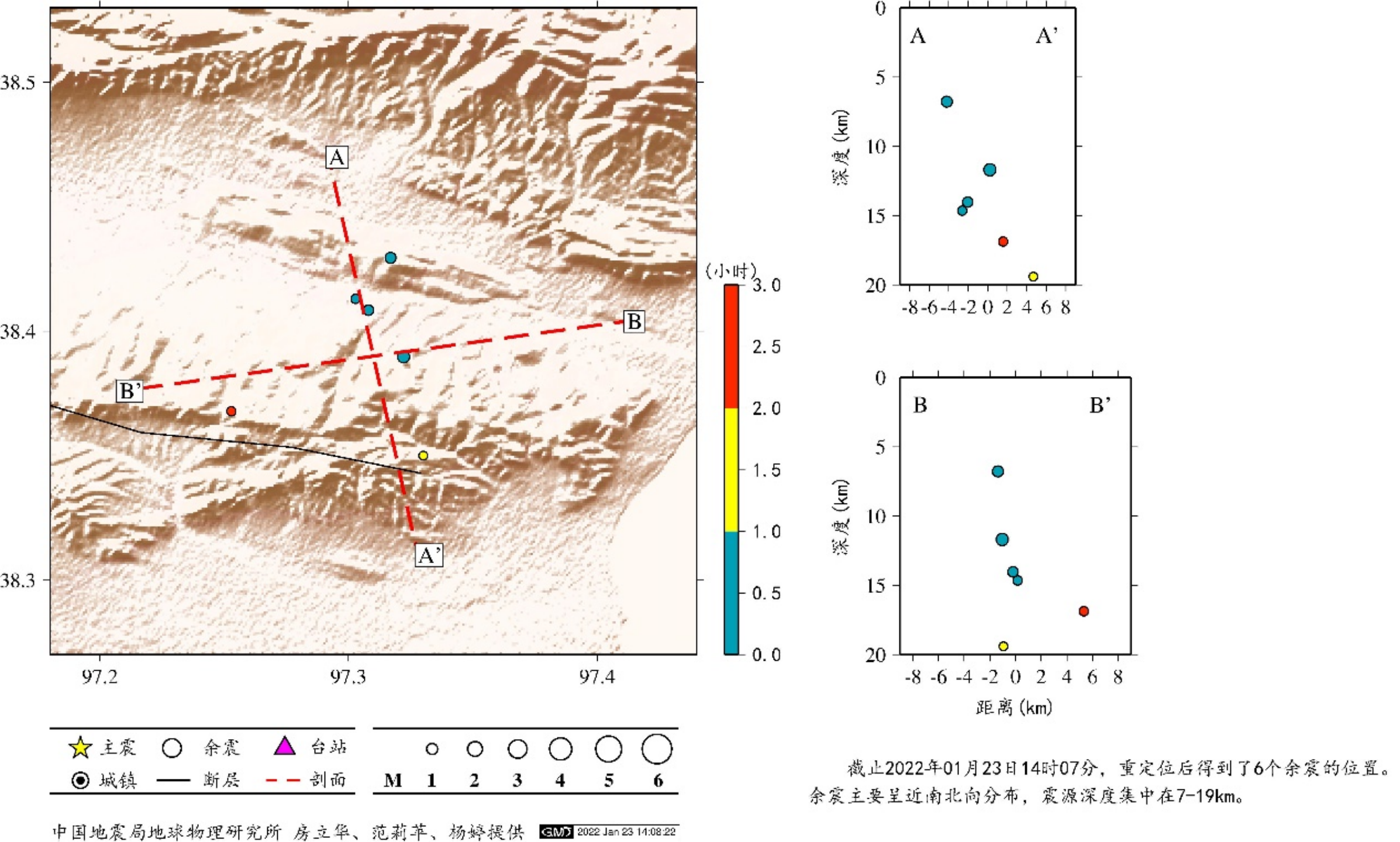截至2022年01月23日14時07分,重定位后得到了6個余震的位置。余震主要呈近南北向分布,震源深度集中在7-19km。