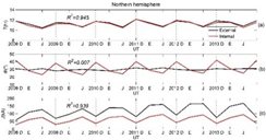 研究使用2008至2012年東亞-大洋洲扇區(qū)20個地磁臺站(見圖a)觀測,利用球諧分析(SHA)建立了地磁Sq內(nèi)、外源等效電流體系季節(jié)(D冬季、E分點、J夏季)模型(見圖b、圖c),分析模型電流渦中心參數(shù)(地方時T、緯度Φ、電流強度J)的季節(jié)變化特征表明(見圖d、圖e):(1)從D到E再到J季節(jié),內(nèi)源和外源電流T均在北半球逐漸減小,即渦中心地方時從正午向午前移動;南半球則逐漸增大,即從正午向午后移動。(2)內(nèi)源和外源電流渦中心電流強度J均為從半球冬季到分點季節(jié)再到半球夏季逐漸增強。內(nèi)源電流增強的速率比外源電流的大。(3)外源電流Φ南半球有一定的季節(jié)變化,內(nèi)源電流Φ則在北半球有著明顯的季節(jié)變化。進一步的相關(guān)分析結(jié)果表明(見圖f、圖g),E季節(jié)內(nèi)源與外源電流T相關(guān)最高,在D和J季節(jié),二者的電流強度J相關(guān)最高。