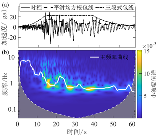 圖1 地震動強度與頻率非平穩(wěn)特性的數值模型(a)加速度時程與強度包線;(b)小波幅值譜及主頻率