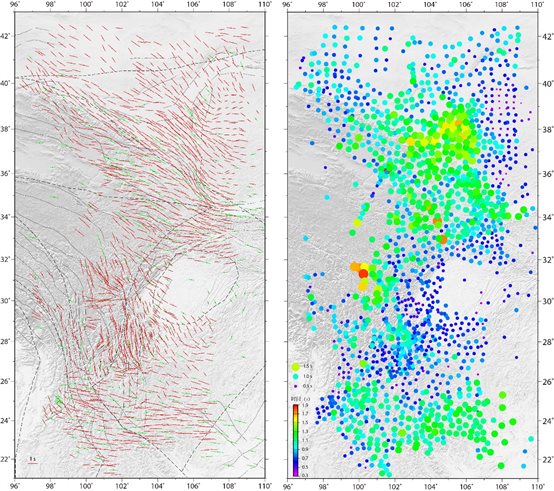 圖4 青藏高原東緣上地幔各向異性圖像(左圖為各臺(tái)站XKS波分裂測量結(jié)果,其中紅色為流動(dòng)臺(tái)站結(jié)果,綠色為固定臺(tái)站結(jié)果,右圖為快、慢波時(shí)間延遲分布。)