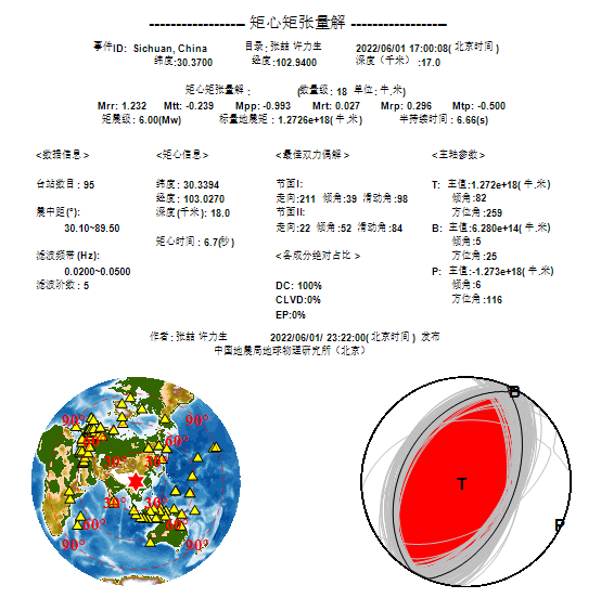 矩心矩張量反演研究中,張喆等使用95道震中距30.10°~89.50°范圍的遠(yuǎn)場寬頻帶多分量波形數(shù)據(jù),采用了基于貝葉斯和“馬爾可夫鏈-蒙特卡羅”(MCMC)算法的反演方法。獲得的最優(yōu)模型顯示,此次地震的標(biāo)量地震矩為1.2726×1018N·m、矩震級Mw6.00,矩心時間為6.70s、震源半持續(xù)時間6.66s,矩心坐標(biāo)為30.3394°N、103.0270°E、矩心深度18.0km。斷層面解的節(jié)面I:走向211°/傾角39°/滑動角98°,節(jié)面II:走向22°/傾角52°/滑動角84°。此外,最佳雙力偶成分絕對占比100%,觀測數(shù)據(jù)與合成數(shù)據(jù)整體相關(guān)度為0.88。