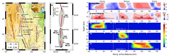 圖5 考慮歷史地震和安寧河斷層的震間閉鎖估計非均勻應(yīng)力分布,通過破裂動力學(xué)模擬揭示,現(xiàn)階段安寧河斷裂帶不會發(fā)生貫穿整個斷裂的大地震,安寧河斷裂帶北段附近發(fā)生地震的震級上限在7.3級左右