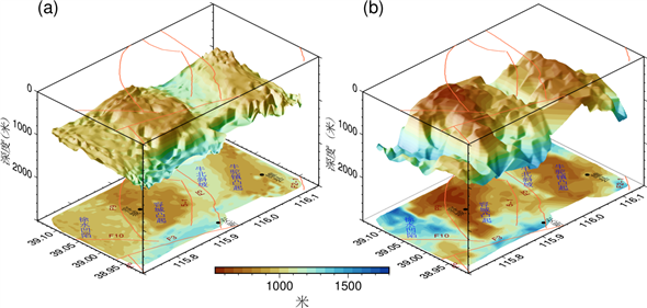 中國地震局地球物理研究所丁志峰、魯來玉團隊分別在北京城市副中心和河北雄安新區(qū)按照平均臺間距1公里的標準建設了兩個短周期密集臺陣,基于團隊發(fā)展的聚束分析地震干涉成像新方法,構建了兩個地區(qū)的沉積層厚度和高分辨率三維剪切波速度模型(圖1和圖2),該模型與研究區(qū)的構造單元分布和已知的鉆孔等地質地球物理資料高度相關,表明了新方法的有效性。