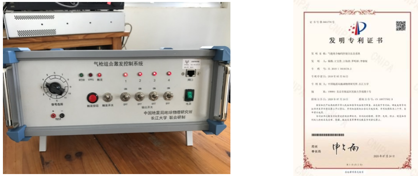 圖1 自主研發(fā)的氣槍組合激發(fā)控制系統(tǒng)及獲得發(fā)明專利證書
