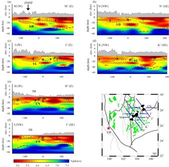 (1)青藏高原東南緣地殼速度結構具有明顯的非均勻性,中下地殼中存在兩個明顯的條帶狀低速異常區(qū)域。西側的低速異常位于川滇菱形塊體西北部,沿麗江-小金河斷裂帶分布,終止于紅河斷裂帶附近;東側的低速異常出現(xiàn)在小江斷裂帶附近,總體沿NE-SW方向分布;