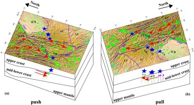 (3)青藏高原東南緣的中下地殼低速體使得上下地殼解耦,下地殼拖曳著上地殼運動,并在東西兩側分別提供“拉”和“壓”的構造載荷作用,表現(xiàn)為不同的孕震機制(圖3)。