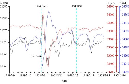 圖2 發(fā)生在1958年的超大磁暴,這是近百年來我國地磁臺(tái)記錄到的最大磁暴事件