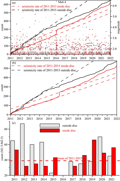 圖3 研究區(qū)域(圖2中紫色方框)地震活動(dòng)性。(a)震級(jí)≥1.5的事件的累積曲線。圓點(diǎn)表示事件的大?。?/span>(b)1.5至2.5級(jí)事件的累積曲線。(a)和(b)中的紅色和黑色實(shí)線分別表示圓盤內(nèi)外的地震活動(dòng)累積曲線;(c)每年1.5至2.5級(jí)地震的數(shù)量,紅色虛線表示2011-2015年圓盤內(nèi)的平均值