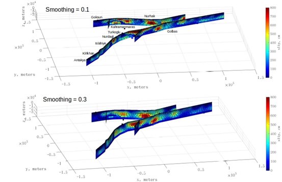 圖2 2023土耳其雙震的3維同震滑動模型,上圖使用光滑權重0.1,下圖使用光滑權重0.3,黑色圓點代表斷層附近城市名稱和地名,藍色圓點代表Mw7.8地震的震中位置