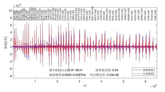 張喆等的矩心矩張量反演采用了震中距 31.07°~ 89.61°范圍內(nèi)56道長周期多分量W-phase數(shù)據(jù),基于網(wǎng)格搜索確定了矩心時空位置與矩張量解,獲得的最優(yōu)模型結(jié)果顯示,此次地震的標(biāo)量地震矩為1.5008×1020牛﹒米、矩震級Mw為7.38,矩心坐標(biāo)為北緯24.02度、東經(jīng)121.66度、矩心深度29.0公里,矩心時刻為13.0秒。斷層面解為節(jié)面I:走向015°/傾角061°/滑動角072°,節(jié)面II:走向228°/傾角034°/滑動角119°。雙力偶成分占比91%,觀測數(shù)據(jù)與合成數(shù)據(jù)整體相關(guān)度為0.94。