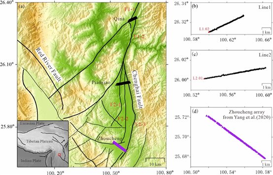 川滇地區(qū)為我國(guó)長(zhǎng)期以來(lái)的地震重點(diǎn)監(jiān)視區(qū)之一,程海斷裂帶是該區(qū)域的重要活動(dòng)斷裂帶,大尺度上受到了青藏高原東向擠出作用的影響,小震震群活動(dòng)頻繁,地震危險(xiǎn)性增強(qiáng)。歷史上該區(qū)域曾多次發(fā)生大地震,例如1515年永勝73/4地震,2001年永勝6.0級(jí)地震等。開(kāi)展程海斷裂帶結(jié)構(gòu)探測(cè)是理解地震孕育和發(fā)生過(guò)程的基礎(chǔ),也是該地區(qū)地震災(zāi)害評(píng)價(jià)、城市地下空間利用的重要支撐。
