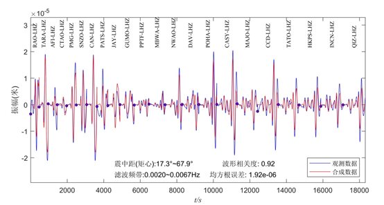 張喆等的矩心矩張量反演采用了震中距 17.27°~ 67.93°范圍內22道長周期垂直分量W-phase數(shù)據(jù),基于網格搜索確定了矩心時空位置與矩張量解,獲得的最優(yōu)模型結果顯示,此次地震的標量地震矩為1.0394×1020?!っ?/span>、矩震級Mw為7.28,矩心坐標為南緯17.69度、東經167.97度、矩心深度52公里,矩心時刻為11秒,半持續(xù)時間12.16秒。斷層面解為節(jié)面I:走向155°/傾角019°/滑動角171°,節(jié)面II:走向254°/傾角087°/滑動角072°。雙力偶成分占比81%,觀測數(shù)據(jù)與合成數(shù)據(jù)整體相關度為0.92。