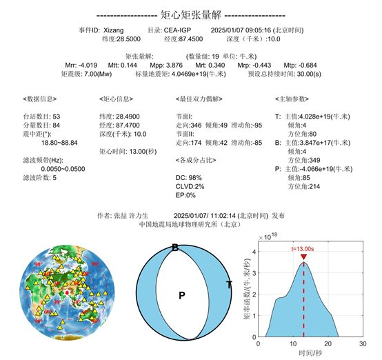 矩心矩張量反演研究中,張喆等通過(guò)矩心矩張量和同步源反演方法,使用震中距在18.80~88.84度之間的84道寬頻帶多分量體波數(shù)據(jù)作為觀測(cè)資料,獲得的矩張量與震源時(shí)間函數(shù)的最優(yōu)模型結(jié)果顯示,此次地震的標(biāo)量地震矩為4.0469×1019?!っ?、矩震級(jí)Mw為7.00,震源持續(xù)時(shí)間23秒左右,矩率函數(shù)的峰值時(shí)刻第13秒,矩心坐標(biāo)為28.49°N、87.47°E,矩心深度10.0公里。斷層面解為節(jié)面I:走向346°/傾角049°/滑動(dòng)角-095°,節(jié)面II:走向174°/傾角042°/滑動(dòng)角-085°。雙力偶成分占比98%,觀測(cè)數(shù)據(jù)與合成數(shù)據(jù)整體相關(guān)度為0.94。從震源機(jī)制來(lái)看,此次地震以正斷層特征為主。