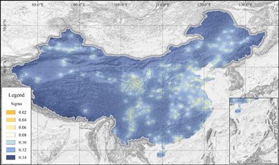 圖2 新版中國大陸場地VS30地圖對應(yīng)的估計(jì)誤差標(biāo)準(zhǔn)差地圖