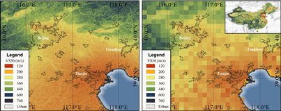 VS30指地表以下30米深度內(nèi)時間平均的剪切波速,是地震學(xué)和地震工程學(xué)領(lǐng)域國際通用的進(jìn)行場地條件分類進(jìn)而表征地震動場地效應(yīng)的主要參數(shù)。上世紀(jì)90年代被提出以來,VS30廣泛地應(yīng)用于地震動衰減關(guān)系、地震危險性分析、地震風(fēng)險評估等諸多領(lǐng)域。2000年后,全球各國學(xué)者提出了各類利用其他參數(shù)估計(jì)VS30的擬合模型,并繪制了全球各地的VS30地圖。