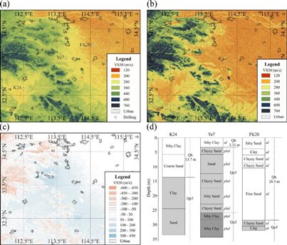 圖4 新版地圖(a)與USGS地圖(b)在太行山附近區(qū)域的對比(c),實(shí)測地質(zhì)鉆孔(d)證實(shí)了新版地圖更好地區(qū)分了山間盆地、山前、和平原等不同地貌的VS30差異特征
