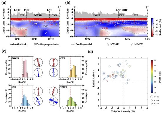 中國地震局地球物理研究所常利軍研究員團隊與北京大學宋曉東教授合作,基于在東構(gòu)造結(jié)東南段新布設(shè)的寬頻帶地震臺陣,以及中國地震科學探測臺陣I期和區(qū)域固定臺網(wǎng)的觀測數(shù)據(jù),獲得了研究區(qū)分辨率達25km的三維S波速度和各向異性結(jié)構(gòu)(圖1)。高精度的成像結(jié)果顯示:東構(gòu)造結(jié)東南段存在厚度不等的中、下地殼低速區(qū),在多條斷裂和高速巖體阻擋下,韌性物質(zhì)主要局限于活動塊體邊界。徑向各向異性結(jié)構(gòu)揭示,高原內(nèi)部低速帶大多與正徑向各向異性相對應(yīng)。然而,由北至南低速帶的各向異性強度逐漸減弱,局部地區(qū)轉(zhuǎn)變?yōu)樨搹较蚋飨虍愋裕▓D2),不具備形成大規(guī)模連續(xù)的地殼通道流條件。分析認為具有正徑向各向異性的地殼低速帶揭示了部分熔融的局部物質(zhì)流,而非大規(guī)模連續(xù)韌性流。