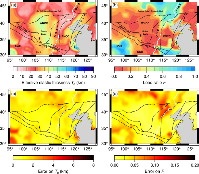 圖1華北克拉通及鄰區(qū)(a)巖石圈有效彈性厚度(Te)(b)初始載荷比(F)(c)Te結(jié)果標準差(d)F結(jié)果標準差。