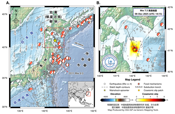 震源機(jī)制和震源深度表明,該震很可能發(fā)生在太平洋板塊向西北俯沖至鄂霍茨克微板塊(通常被視為北美板塊體系的一部分)之間的板間界面上,為匯聚型板塊邊界的大型逆沖事件。初步有限斷層反演結(jié)果(張旭、張勇、許力生、陳運(yùn)泰等)顯示,主要滑移集中在板間界面中深部(圖1 B),遠(yuǎn)離海溝淺部界面,因此僅在近場產(chǎn)生中小規(guī)模海嘯,未出現(xiàn)2011年日本東北大地震那樣的巨大海嘯。本州島位于鄂霍茨克微板塊上盤,此處太平洋板塊以約83mm/yr的速率俯沖,海溝前緣洋殼年齡約130–140 Ma,屬冷而老的洋殼,是全球收斂速率較高的俯沖帶之一。
