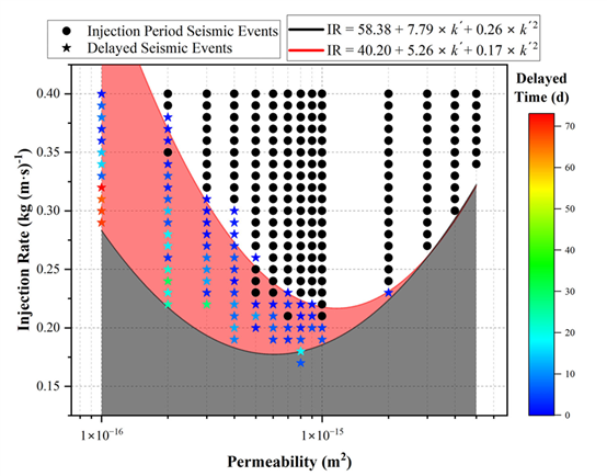 研究量化了流體-固體耦合效應(yīng)對(duì)地震時(shí)序、位置的影響,證實(shí)了完全耦合模型能更真實(shí)反映地震延遲特性,修正了傳統(tǒng)解耦/單向耦合模型導(dǎo)致的延遲時(shí)間預(yù)測(cè)偏差。通過大規(guī)模參數(shù)掃描,構(gòu)建了經(jīng)驗(yàn)化的注入速率-滲透率(IR-k)相圖,清晰劃分出“即時(shí)觸發(fā)”“延遲觸發(fā)”與“無觸發(fā)”三個(gè)區(qū)域,從而為現(xiàn)場(chǎng)注采方案優(yōu)化、風(fēng)險(xiǎn)分級(jí)管控與工程安全決策提供了可靠的物理依據(jù)和前瞻性評(píng)估工具。