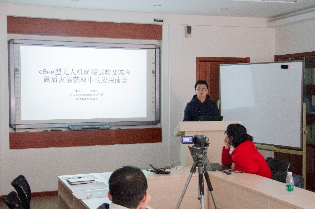 王偉平同學(xué)的研究方向為余震定位、地殼結(jié)構(gòu)反演和無人機(jī)災(zāi)情獲取。此次的報告題目為:eBee型無人機(jī)航攝試驗及其在震后災(zāi)情獲取中的應(yīng)用前景。在此次報告中,王偉平同學(xué)分別從eBee型無人機(jī)的簡介,應(yīng)用概況和在災(zāi)情獲取中的應(yīng)用前景三個方面做了生動的介紹,并展示了兩個航拍試驗,報告內(nèi)容十分新穎,引人入勝。