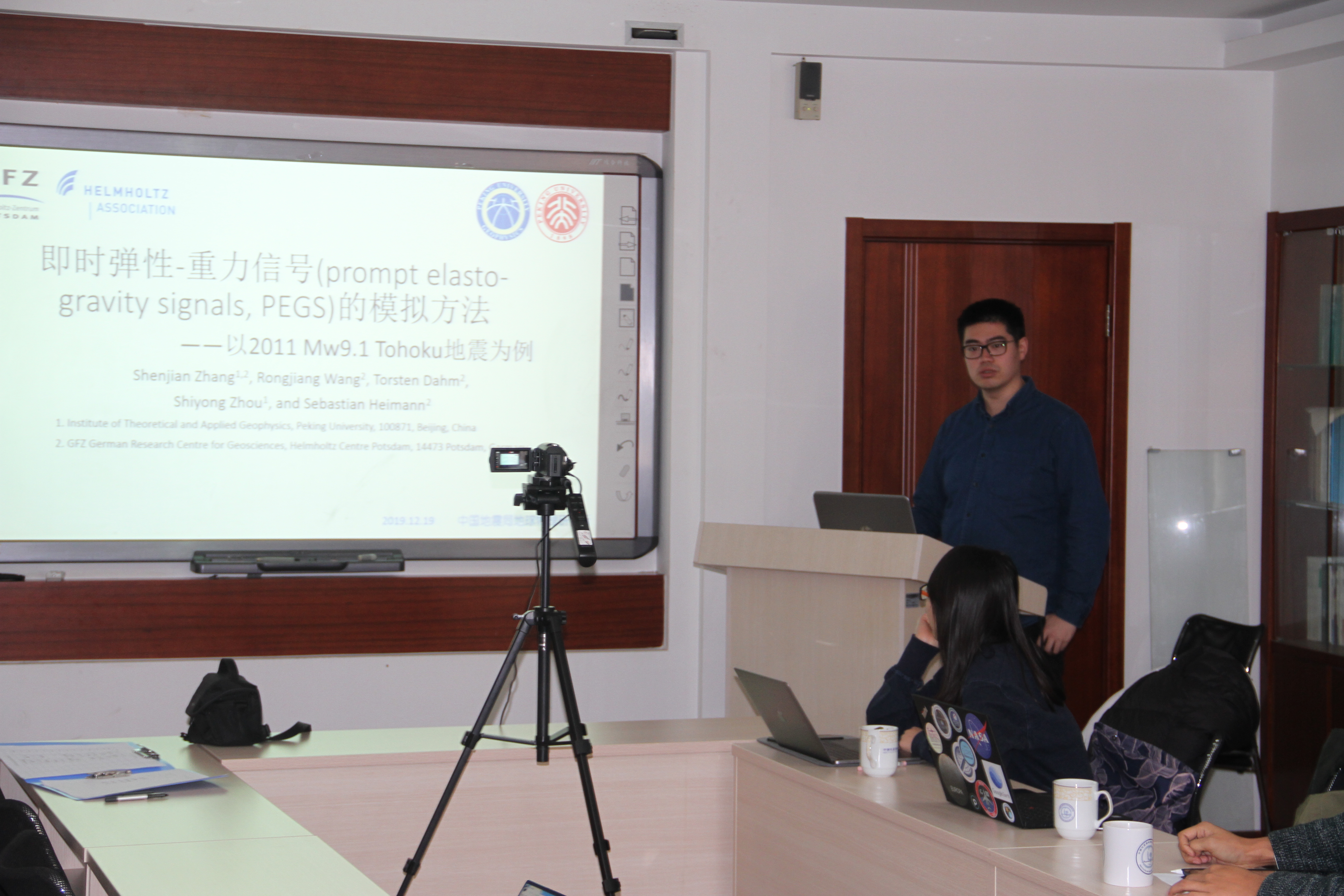 張申健博士的報告題目為《即時彈性-重力信號(prompt elasto-gravity signals, PEGS)的模擬方法》。張申健講到,地震發(fā)生時,斷層附近以及地震波傳播過程中的物質(zhì)重新分布,會在全球產(chǎn)生重力場的擾動,這種擾動會以光速到達臺站并在P波到達前被記錄下來。這些重力擾動也可以作為“二次源”產(chǎn)生地震波,這些地震波的一部分同樣會在P波到達前被儀器記錄下來。另外,由于此前的模擬方法需要大量計算資源,張申健等提出一種全新的,可以直接計算即時彈性-重力信號的方法。并根據(jù)這種方法,基于有限斷層震源模型,給出了2011年Tohoku地震產(chǎn)生的即時彈性-重力信號在時間和空間上的模擬結(jié)果,并對其與震源參數(shù)的依賴關(guān)系進行了分析,為更好的理解和運用這一信號提供了新的途徑和視角。